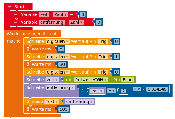 Zur Bestimmung des Abstands muss man auf das Funktionsprinzip des Ultraschallsensors zurückgreifen, das oben beschrieben wurde. Zunächst wird der Trigger-Pin als digitaler Aktor und der Echo-Pin als digitaler Sensor konfiguriert.