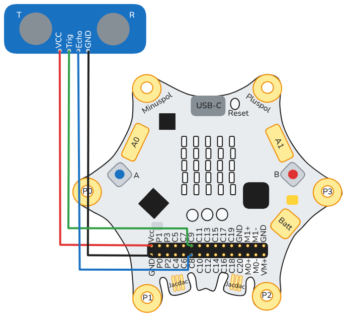 Grundsätzlich sind die folgenden Pins sowohl für den Trigger-Pin als auch für den Echo-Pin geeignet: P0, P1, P2, P3, C8, C9, C13, C14, C15, C16, C17. Beachte, dass die Pins P0, P1, P2, P3 über die äußeren Ringpads (goldene Ringe) schon belegt sein können. Für weitere Informationen schaue dir die Pin-Belegung des Calliope an.