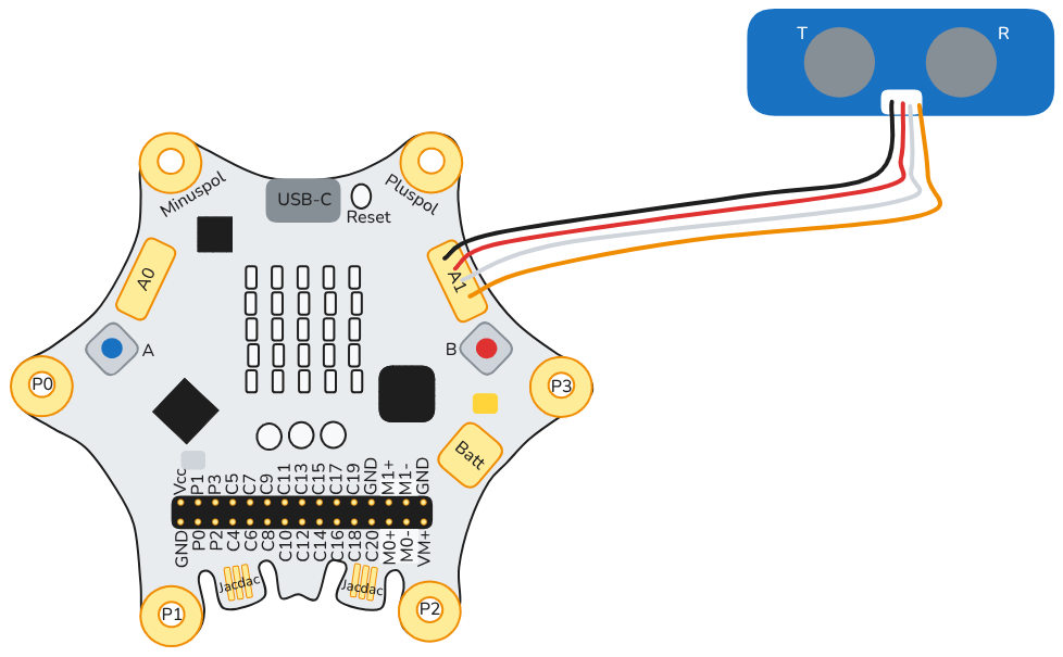 Das schwarze Kabel verbindet die beiden GND-Anschlüsse (Minus-Pol), das rote Kabel verbindet die beiden VCC-Anschlüsse (Plus-Pol, Spannung 3,3V). Das weiße Kabel verbindet den TX-Pin am Calliope mit dem NC-Pin am Ultraschallsensor. Über dieses Kabel kann der Calliope ein Signal an den Ultraschallsensor senden (daher TX - transmit) und darüber die Messung starten. Das gelbe Kabel verbindet den RX-Pin am Calliope mit dem SIG-Pin am Ultraschallsensor. Über dieses Kabel kann der Ultraschallsensor ein Signal an den Calliope senden, das dieser dann lesen kann (daher RX - receive).