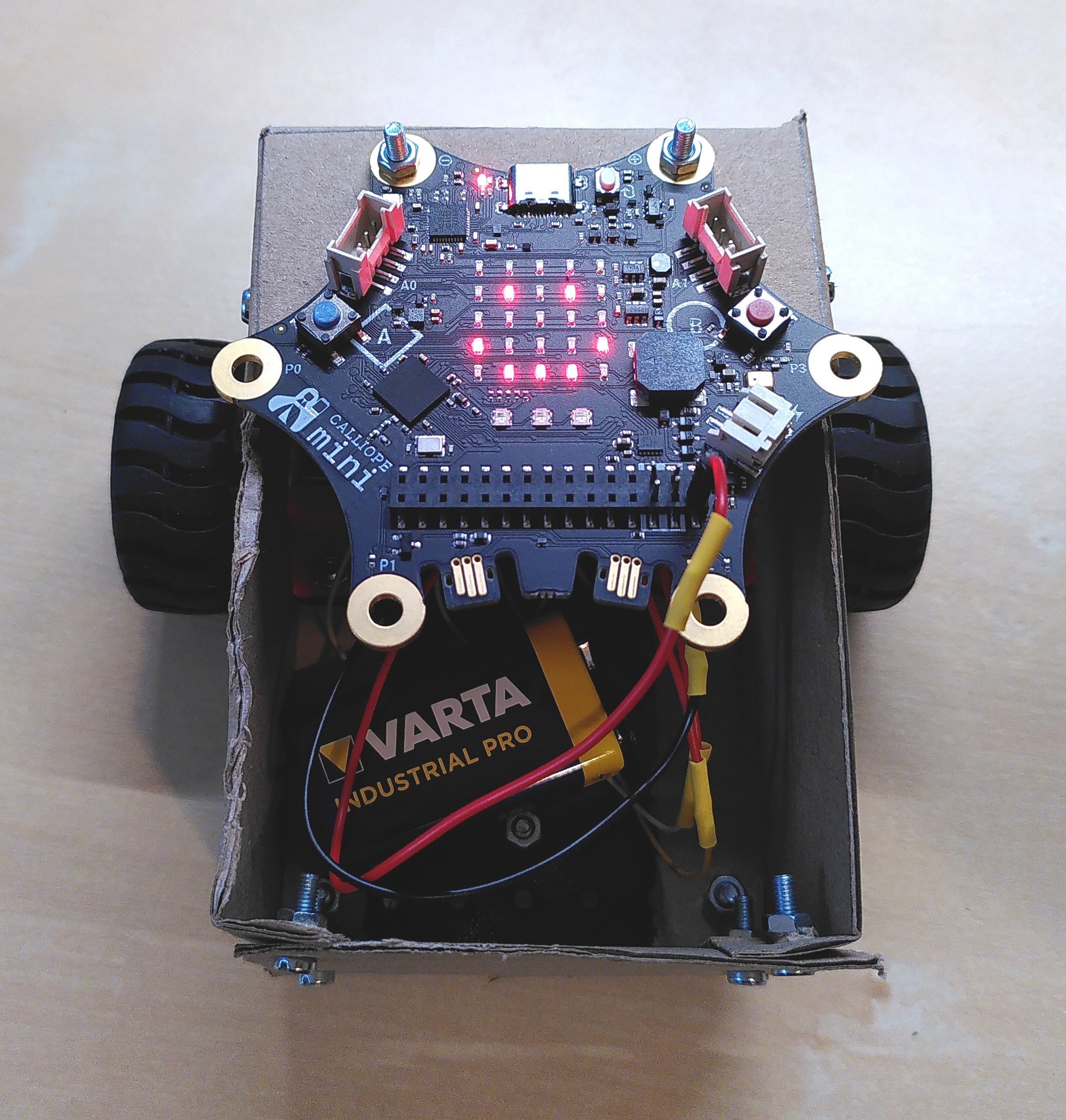 Konstruiere mit Hilfe von Pappe und Schrauben ein geeignetes Gehäuse für deinen Bastelbot! Das Gehäuse sollte so gestaltet sein, dass der Calliope fest darauf sitzt und sowohl der USB-Anschluss als auch die schwarze Pin-Leiste unterhalb der drei RGB-LEDs zugänglich sind. Zudem sollte das Gehäuse so hoch sein, dass man daran weitere Sensoren befestigen kann.