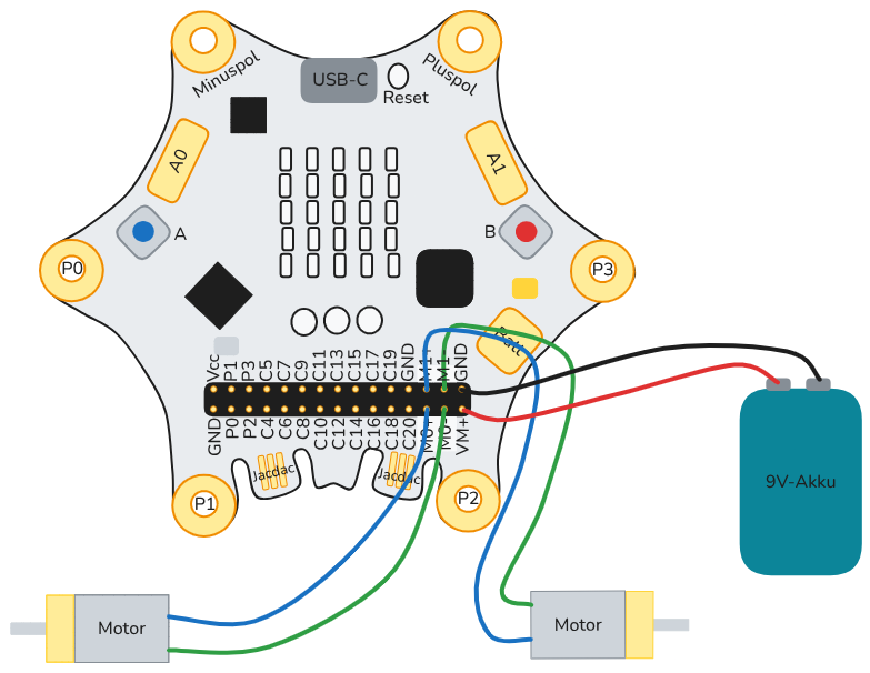 Schließe die Motoren an der Pin-Leiste des Calliope an. Dazu müssen die Kabel des einen Motors mit den Pins M0- und M0+ verbunden werden. Die Kabel des anderen Motors werden mit M1- und M1+ verbunden.